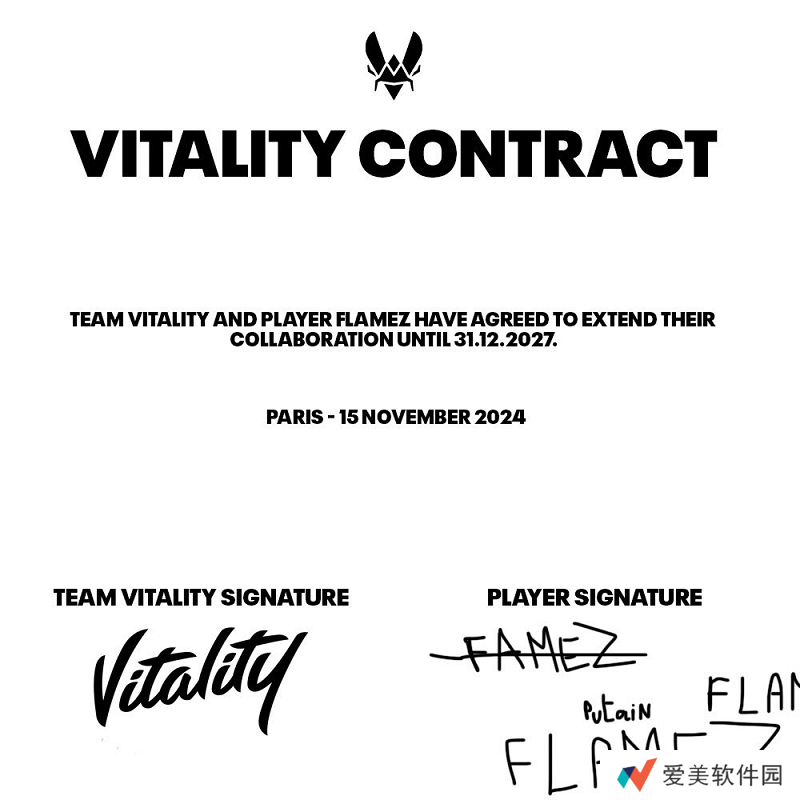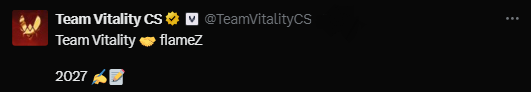 Vitality社媒发布动态:队伍与flameZ的合同已签订至2027年12月31日。