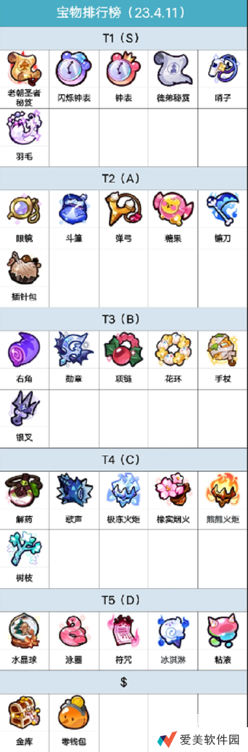 ①老朝圣者的制胜秘笈:该宝物属于超稀有宝物,所以无论在效果还是数值上肯定都独占鳌头,其具体效果是增加己方所有饼干的攻击力,并且增幅十分明显,一级就有30%的加成,这相当于直接把己方单回合的伤害都加了三分之一,如果阵中有那种攻击本就非常突出的角色,那么该道具带来的收益还会更加明显,另外除了输出以外,一些饼干的功能性技能也会吃到攻击加成,所以在一定情况下,也等于变相的提升了己方的增益幅度和回复效率。②小小朝圣者的玩具弹弓:这个是稀有级别的宝物,虽然仅比普通高一些,但它的效果却是降低一名敌人的防御,这个降低防御的目标选择的很精髓,它会令距离最远的一名敌人防御降低,而一般处在最远位置的敌人往往都是敌人的输出核心,同时兼具着脆皮的特性,当这个防御降低以后,己方的其他饼干就能够更好的切死它,而且这个防御的降低幅度也是非常大的,六级的时候就已经达到了48%!因此即使刻意将肉盾放在后面也同样是效果拔群的。③门卫幽灵的坚硬右角:这个算是防御侧的一个宝物,装配后能够提升己方所有饼干的防御值,在游戏内这样能提升全员承伤能力的宝物还是比较稀少的,虽然它的品质只有普通,但如果抽到,建议还是要腾出一个空位来装备上它的,升满后45.4%的防御提升也能够有效抵抗敌人的那些高爆发饼干,同时在面对那些具备减防御的能力时,也不至于没有还手之力。④王子熊熊果冻的果冻钟表:仍然是普通品质的一个宝物,不过它的效果十分具有创造性,能够降低己方全员25.4%的冷却时间,当冷却时间降低之后,己方上阵输出的频率就会增加,而这个增加的频率在持久战中的作用尤为明显,因为相当于你永远比敌人多打四分之一的输出,同时,在施放控制或者回复技能的时候收益也会增加许多。T1:老朝圣者秘籍、闪烁钟表、钟表、徒弟秘笈、哨子、羽毛。T2:眼镜、斗篷、弹弓、糖果、镰刀、插针包。T3:右角、勋章、项链、花环、手杖、银叉。