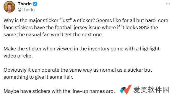 “为什么Major赛事的贴纸只能是一张贴纸呢?除了那些铁杆粉丝以外,选手贴纸就像是足球队的队服一样,如果它跟之前的贴纸对比看起来99%都一样,那普通粉丝可能就没兴趣继续消费了。