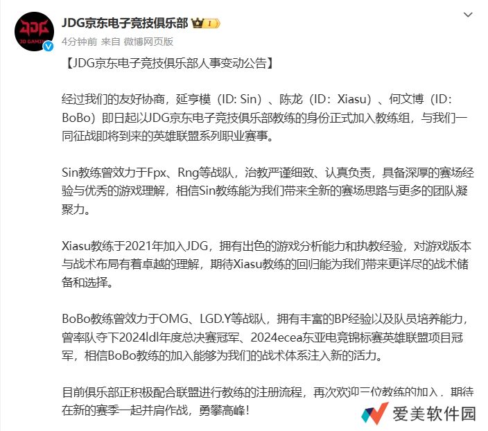 直播吧12月10日讯 官方消息,JDG俱乐部在刚刚公布三则人员变动公告;Sin、Xiasu、BoBo三名教练加入教练组。