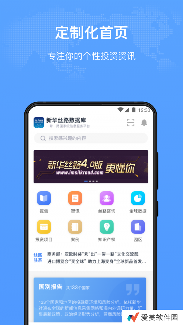 新华丝路APP一款专注于投资资讯的平台,这里提供各种全球数据、投资项目、案例、知识产权、园区、报告等资讯服务。每天都为用户更新最新、最热的投资资讯,资讯内容丰富,用户通过读这些投资资讯的阅读,能够全面帮助用户学习更多的投资知识,也可以掌握当前最新的投资资讯动态,提升自己的投资知识量,轻松完成投资,实现自己的财富管理。还有大量投资项目,了解更多的投资项目、案例,在线学习投资,让您的整个投资操作得到提高,做好投资,收益高。