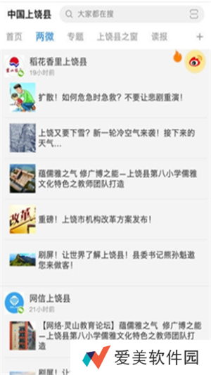 2、开设了两微、专题、上饶县之窗等优秀栏目,并全面融合了上饶县发布、稻花香里上饶县、网信上饶县等微博微信新媒体。