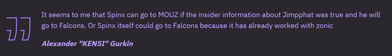 MOUZ战队。又或者Spinx自己也可能去Falcons,因为他之前就和zonic合作过。 ”