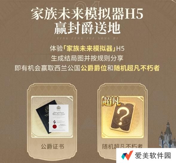 公测后,体验「家族未来模拟器」H5,生成结局图并按规则分享,即有机会赢取现实封爵奖励哦~!你没看错,就是给祖宗大人封爵送地!