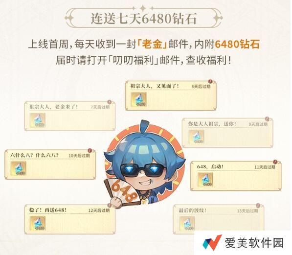 2、连送七天6480钻石,届时请打开「叨叨福利」,查收老金邮件。