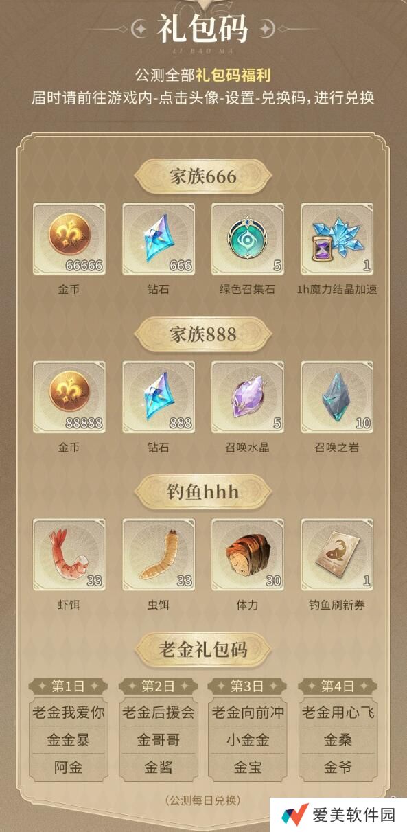 Ps. 老金礼包码是在公测前四天进行分天兑换,请各位祖宗大人们留意兑换开始时间噢