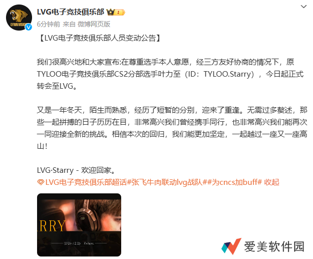 我们很高兴地和大家宣布:在尊重选手本人意愿,经三方友好协商的情况下,原TYLOO电子竞技俱乐部CS2分部选手叶力至(ID:TYLOO.Starry),今日起正式转会至LVG。