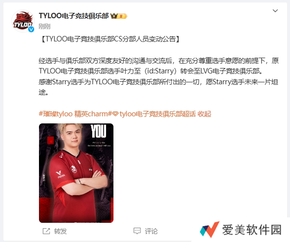 感谢Starry选手为TYLOO电子竞技俱乐部所付出的一切,愿Starry选手未来一片坦途。