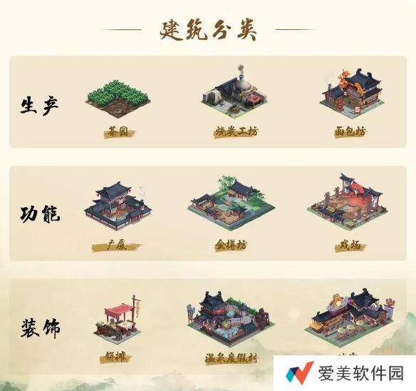 生产类建筑:即生产物资的建筑,例如茶园、烧炭工坊、面包坊等等,通过生产/加工,将原料变为商品;