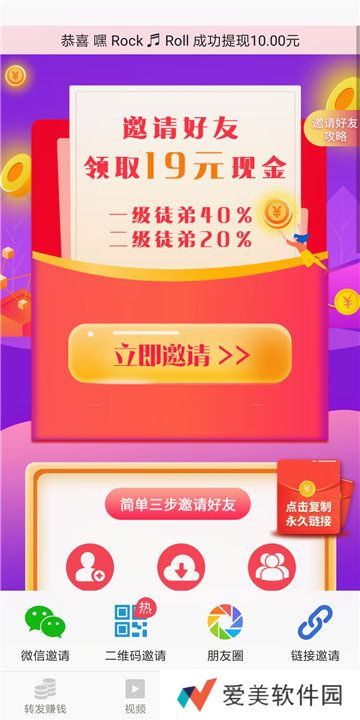 3、邀请好友赚19元和徒弟40%转发收益分成、徒孙20%分成。