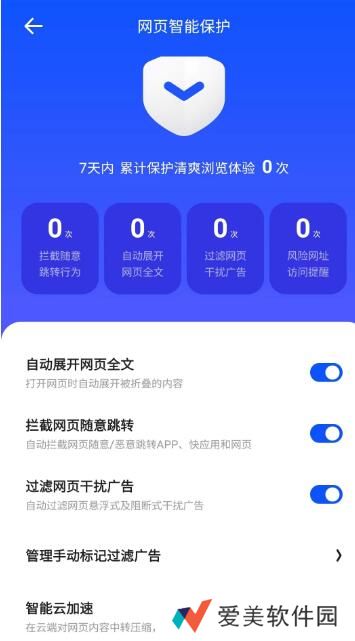 3、选择网页智能保护,把拦截网页随意跳转和过滤广告的功能关掉,注意这一步会有风险。