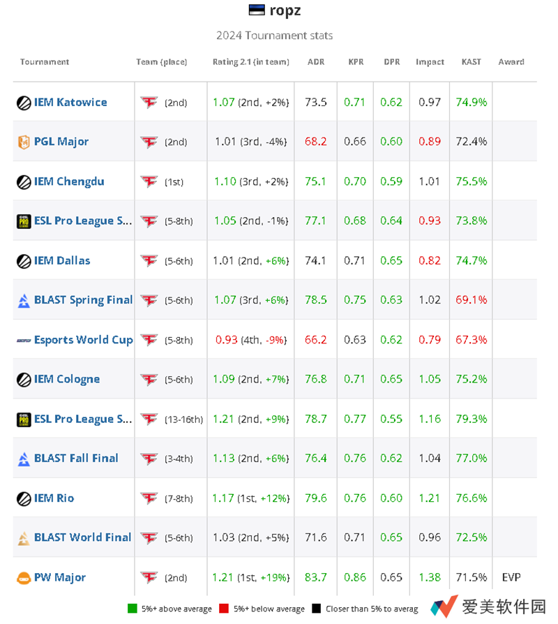 在全年参加的13项重要赛事中,ropz在12项赛事中至少是一名有价值的选手,因此在2024年TOP20选手榜单中稳居第18位。