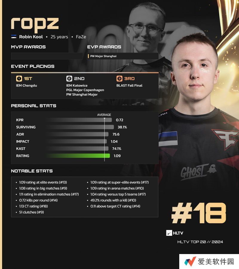 ropz凭借全年高下限数据及上海Major上的精彩发挥,成功荣获本年度TOP18选手。