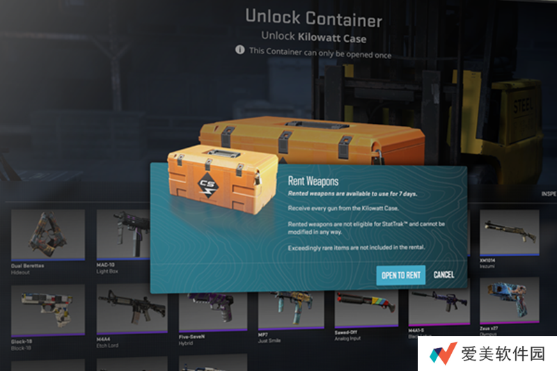 在今年5月24日的更新中,开发人员带来了“开箱租赁皮肤”机制。玩家可以通过17元的钥匙选择“开箱”收获新饰品或租赁七天千瓦武器箱系列皮肤(不包含刀具的皮肤)。而在11月底的更新中,V社进一步将租赁功能拓展到了以前CSGO武器箱中。