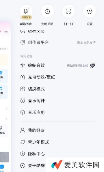 1、进入酷狗,点击三条杠菜单,选择青少年模式。