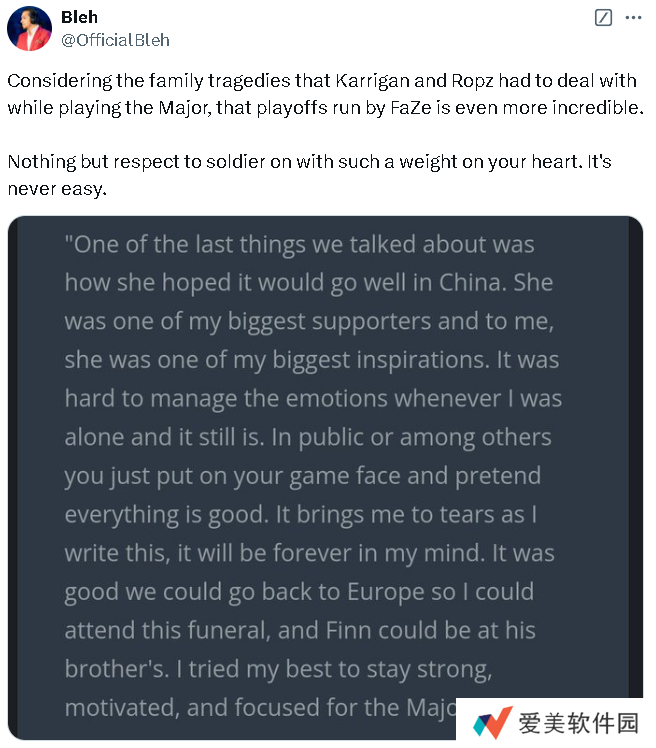 Bleh:考虑到karrigan和ropz在参加Major比赛期间所遭遇的家庭悲剧,FaZe的淘汰赛表现更加令人难以置信。对于在如此沉重的心情下继续前行的他们,我深感敬意。这绝非易事。