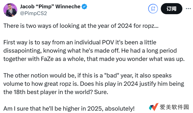 另一种看法是,如果把这称作 “糟糕” 的一年,那也恰恰凸显了ropz的优秀。他在2024年的表现能说明他是世界排名第18的选手吗?当然可以。