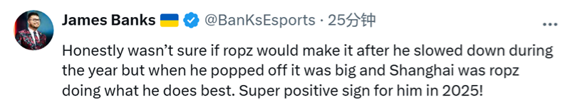 BanKs:说实话,在ropz今年状态有所下滑的时候,我都不确定他还能不能进Top20。但当他爆发的时候,那表现可太出色了。在上海Major上,ropz展现出了他最擅长的一面。这对他2025年来说是个非常积极的信号!