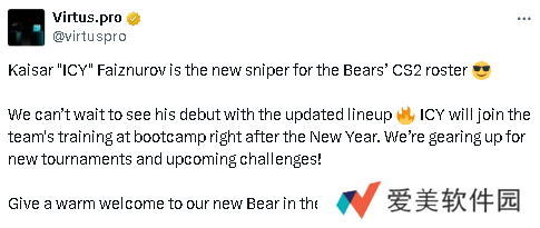 我们迫不及待地想要看到他在新阵容中的首秀, ICY将在新年后正式加入团队,并在训练基地中与队友们一起集训。我们正在为新的比赛和即将到来的挑战做好准备!”