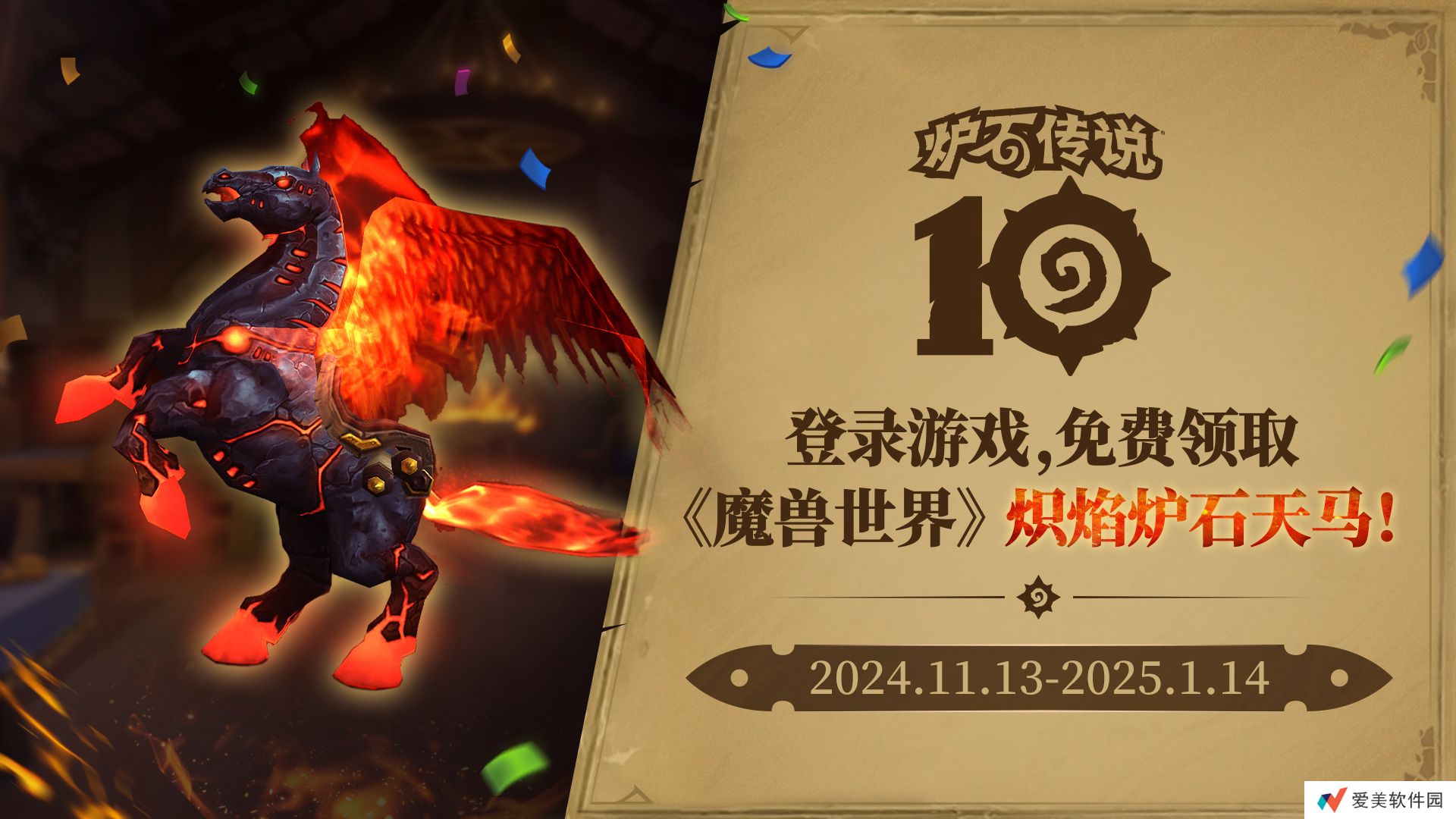 即日起至2025年1月14日,登录《炉石传说》,即可在《魔兽世界》中获得全新坐骑——炽焰炉石天马!新玩家完成新手教程也可领取。
