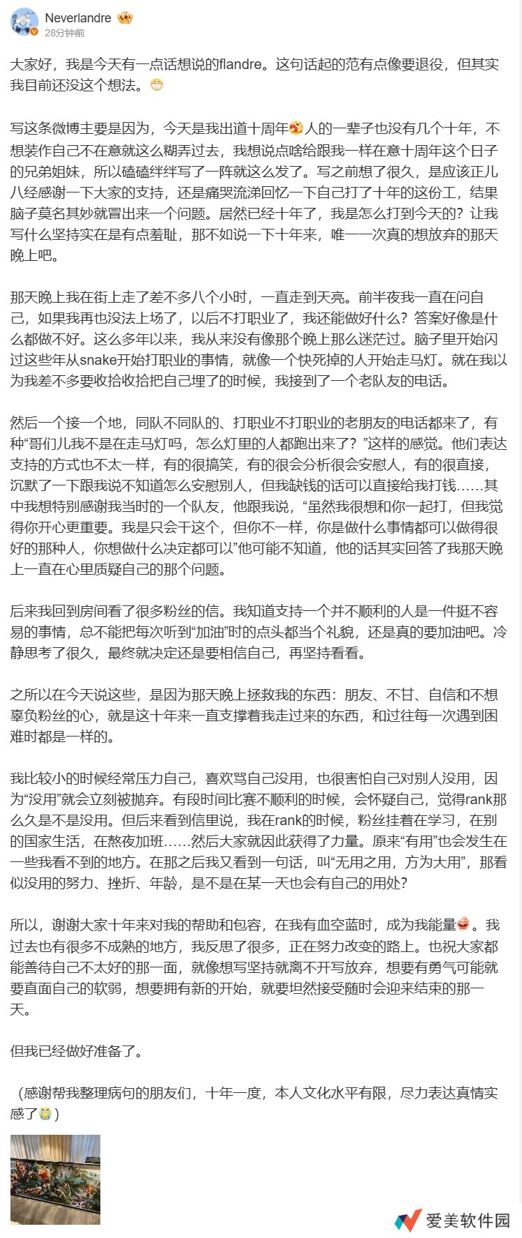 写这条微博主要是因为,今天是我出道十周年,人的一辈子也没有几个十年,不想装作自己不在意就这么糊弄过去,我想说点啥给跟我一样在意十周年这个日子的兄弟姐妹,所以磕磕绊绊写了一阵就这么发了。写之前想了很久,是应该正儿八经感谢一下大家的支持,还是痛哭流涕回忆一下自己打了十年的这份工,结果脑子莫名其妙就冒出来一个问题。居然已经十年了,我是怎么打到今天的?让我写什么坚持实在是有点羞耻,那不如说一下十年来,唯一一次真的想放弃的那天晚上吧。