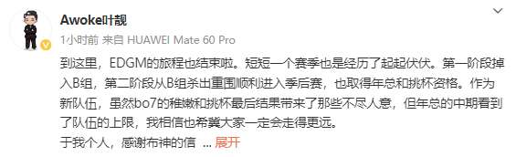 虎扑01月17日讯 Awoke发文告别EDGM:B组杀出重围,拿到年总、挑杯资格