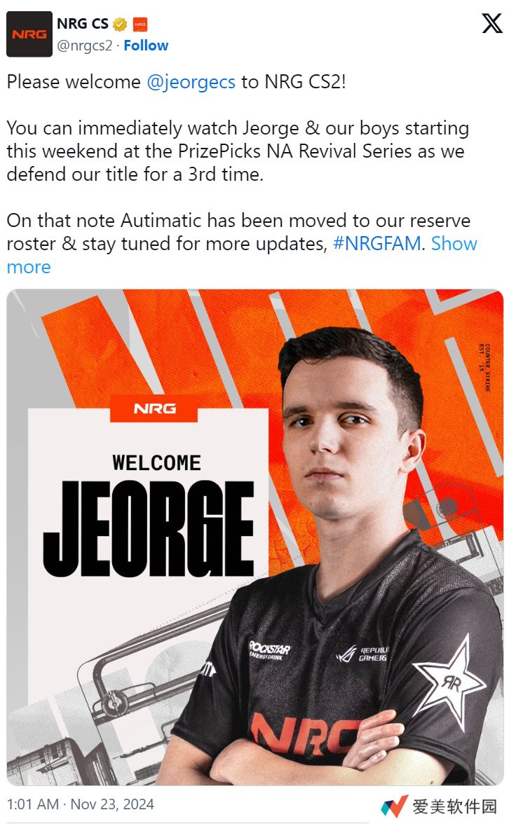NRG宣布签约Jeorge,他将接替autimatic的位置,后者已被调到替补席。