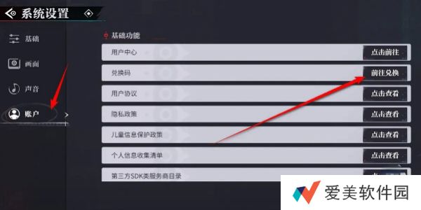 3、在设置界面点击左侧菜单栏中的“账户”选项,就可以找到兑换码入口。
