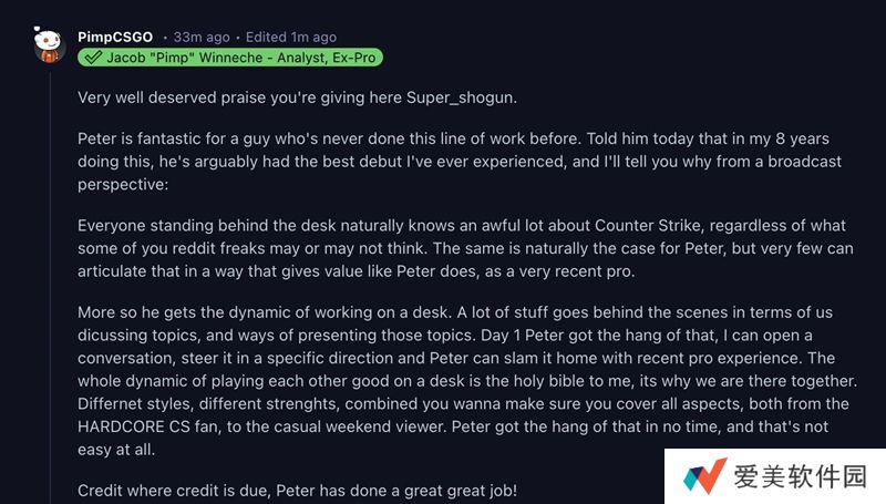 “非常值得称赞。彼得(dupreeh)在解说台的表现非常出色,尽管他之前从未涉足这一领域。