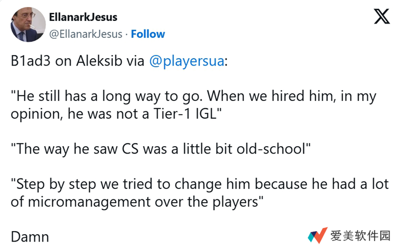 对我来说,签下Aleksib是个很好的选择,便于我实施我的体系,因为我可以比较他之前取得的成绩和我们一起取得的成绩,这样我向他解释 “这是个好方法,这是你终于能学到东西并融入体系的时刻” 就会更容易。从我第一次看到他,从第一次训练开始,我就看到了我期望的态度。有时候改变这类选手很难,他参与过四五个不太成功的项目,所以从逻辑上讲他怎么可能一来就是一线指挥呢?但他需要证明自己,这也是一线赛场的重要部分,而且一线这个概念也很主观,什么是一线?这是我自己的标准,不是客观标准。有时候我解释这些,是希望他能从原来的水平变得更好,所以 “一线” 就是比他原来更好的水平,而不是他原来所处的水平。