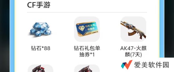 钻石*88、钻石礼包单抽劵*1、AK47-火麒麟(7天)、黑武器手雷(7天)、黑武器烟雾弹(7天)、黑武器闪光弹(7天)。