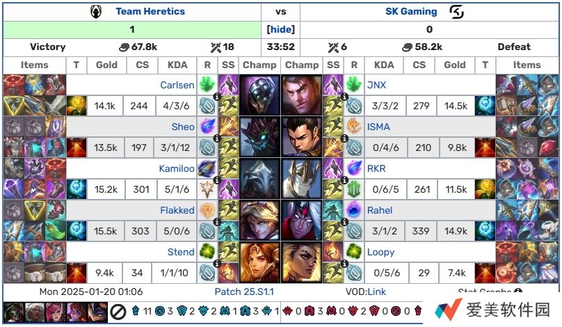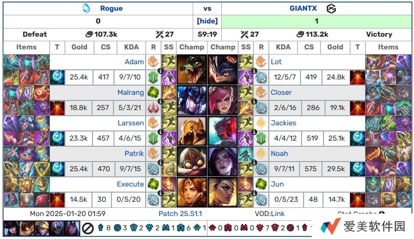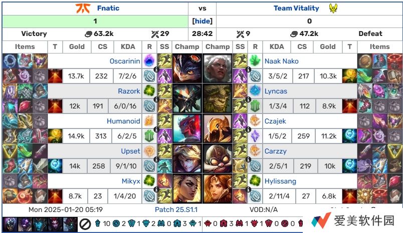 直播吧01月20日讯 2025LEC冬季赛第一周第二个比赛日结束;五场Bo1的具体赛果计分板如下: