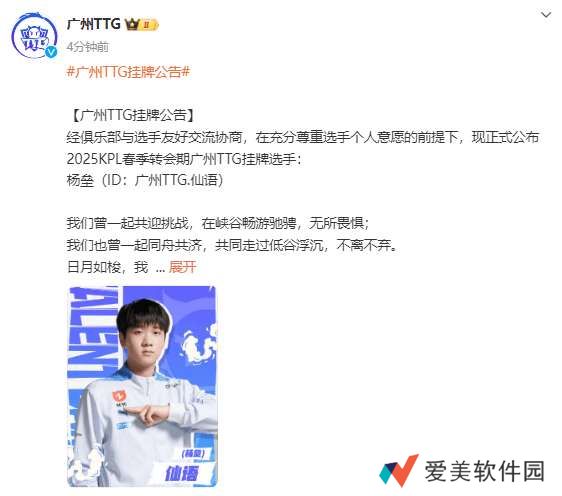 【广州TTG挂牌公告】经俱乐部与选手友好交流协商,在充分尊重选手个人意愿的前提下,现正式公布2025KPL春季转会期广州TTG挂牌选手:杨垒(ID:广州TTG.仙语)我们曾一起共迎挑战,在峡谷畅游驰骋,无所畏惧;我们也曾一起同舟共济,共同走过低谷浮沉,不离不弃。日月如梭,我们共同谱写了诸多故事,或是高光,或有失意。但一直以来,我们始终怀揣着同一个目标坚定向前。我们坚信星星会一直闪耀,金子也一定会发光。感谢仙语选手在队期间的辛勤付出,他的汗水和努力构成了我们彼此独一无二的回忆。长风破浪会有时,直挂云帆济沧海。不论结果如何,衷心祝愿仙语选手前程似锦!在未来的职业生涯中,继续发光发热!
