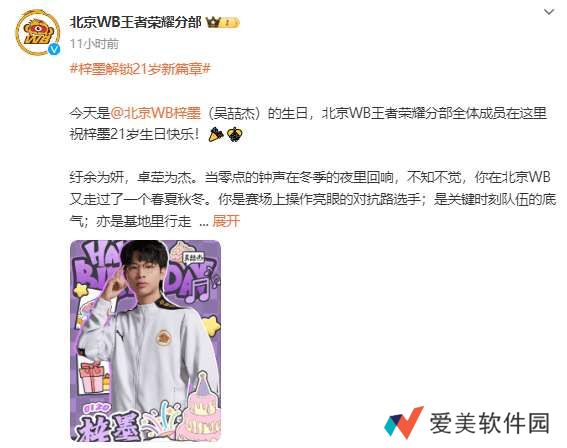 今天是北京WB梓墨(吴喆杰)的生日,北京WB王者荣耀分部全体成员在这里祝梓墨21岁生日快乐!