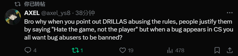 AXEL(外媒编辑):兄弟,为什么当你们指出DRILLAS钻规定漏子时,大家会以“我们讨厌的是游戏,而非选手”来为他们辩解,但当游戏中出现BUG的时候,你们都希望封禁那些滥用BUG的人?