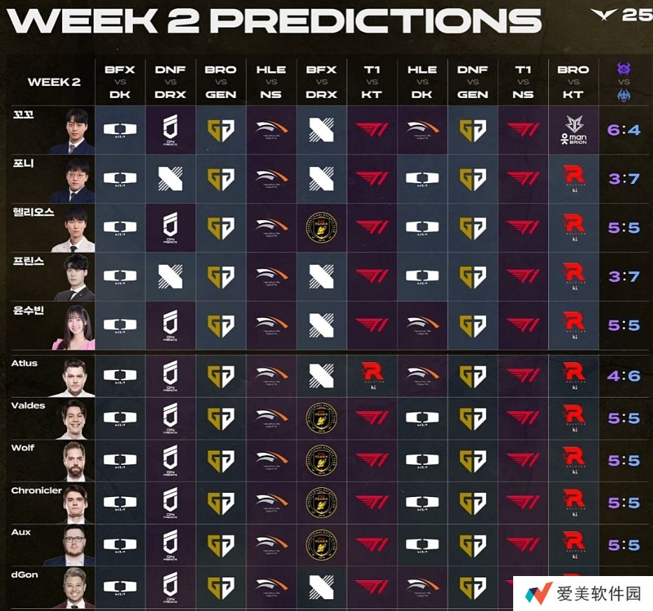 直播吧01月22日讯 LCK CUP第二周赛程进行中,官方直播间公布了各解说/业内人士对Week2比赛的预测: