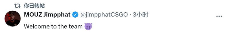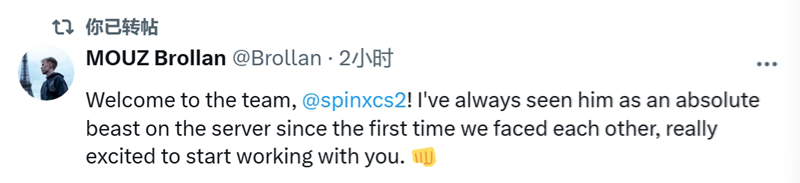 Spinx:今天我在MOUZ战队开启新篇章。能加入这群伙伴,我兴奋不已,期待与他们并肩作战。