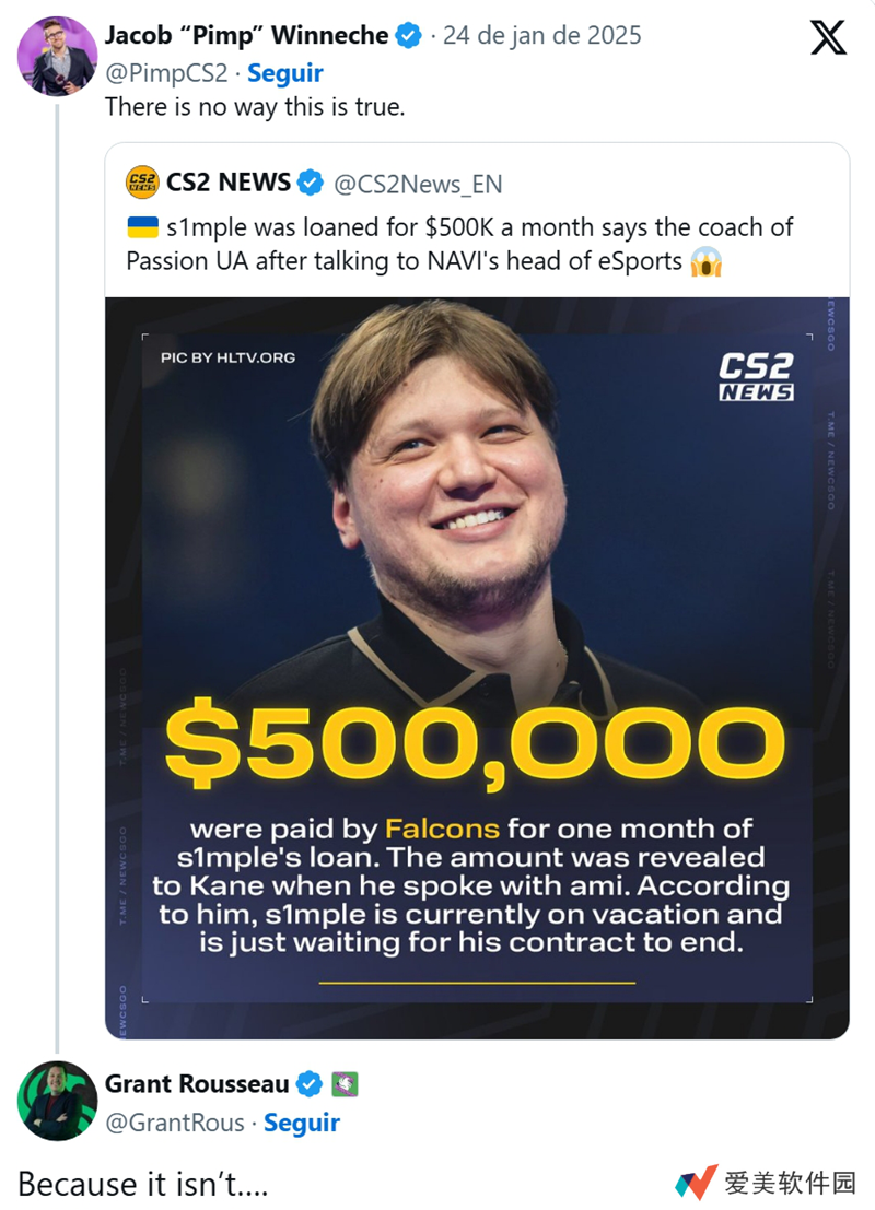 Passion UA的Kane日前表示,Falcons为租借s1mple一月可能支付了约50万美元。不过这家沙特电竞俱乐部的工作人员否认了这一金额。