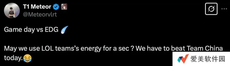 淘汰赛首战对阵EDG赛前,Meteor发文:比赛日对阵EDG,我们能借用一下LOL战队的能量吗?今天我们得击败中国队。