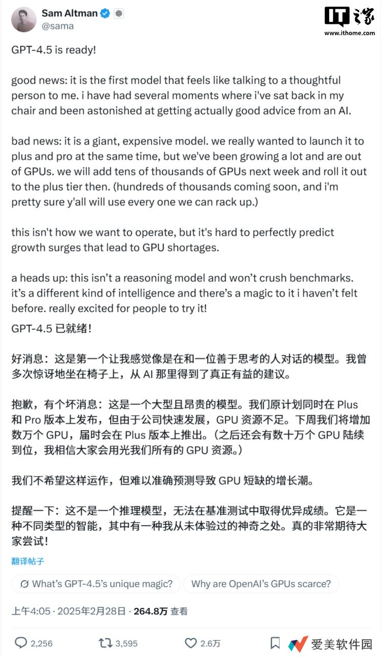 在 X 平台上的一篇帖子中,奥尔特曼指出,GPT-4.5 是一个“庞大”且“昂贵”的模型,需要数万个额外的 GPU 才能向更多 ChatGPT 用户开放。GPT-4.5 将首先推向 ChatGPT Pro 订阅者,随后将在下周向 ChatGPT Plus 用户推出。
