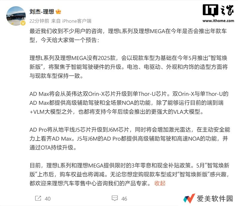 本站 2 月 28 日消息,理想汽车副总裁刘杰今日在微博透露,理想 L 系列及理想 MEGA 没有 2025 款,会以现款车型为基础在今年 5 月推出“智驾焕新版”,将聚焦于智能驾驶硬件的升级。电池、电驱动、外观和内饰的造型方面将与现款车型保持一致。