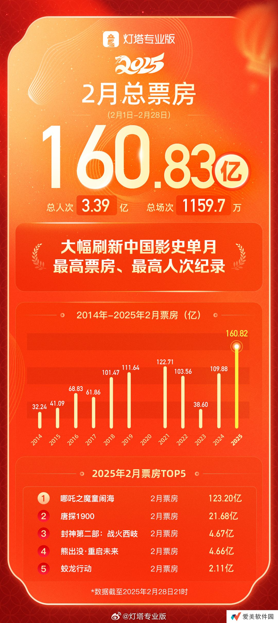 本站 2 月 28 日消息,据网络平台数据,截至 2 月 28 日 21 时,2025 年 2 月总票房达 160.83 亿、总人次 3.39 亿、总场次 1159.7 万,大幅刷新中国影史单月大盘票房、人次纪录。