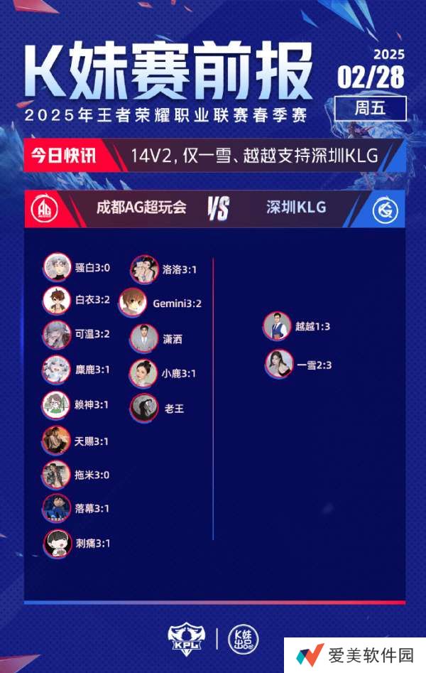 AG对战KLG :14V2,仅一雪、越越支持深圳KLG。