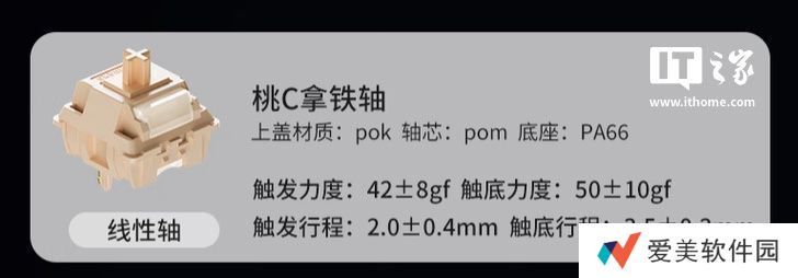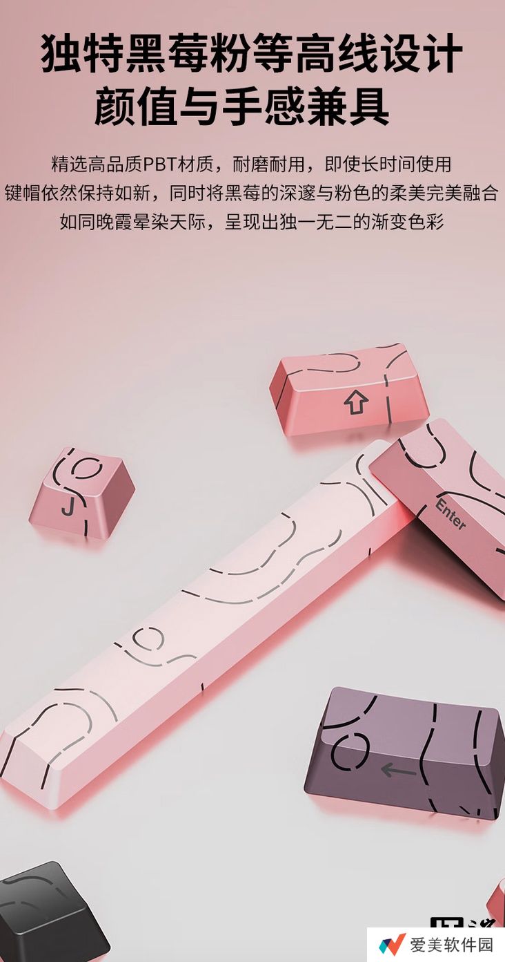 该键盘使用 Gasket结构多层填充内胆,目前上市这一“黑莓粉渐变等高线”版本号称进行填充升级“手感更软弹,杜绝空腔音”,键盘搭载“桃 C 拿铁轴”,配备PBT粉紫色键帽,支持全键热插拔、全键无冲。