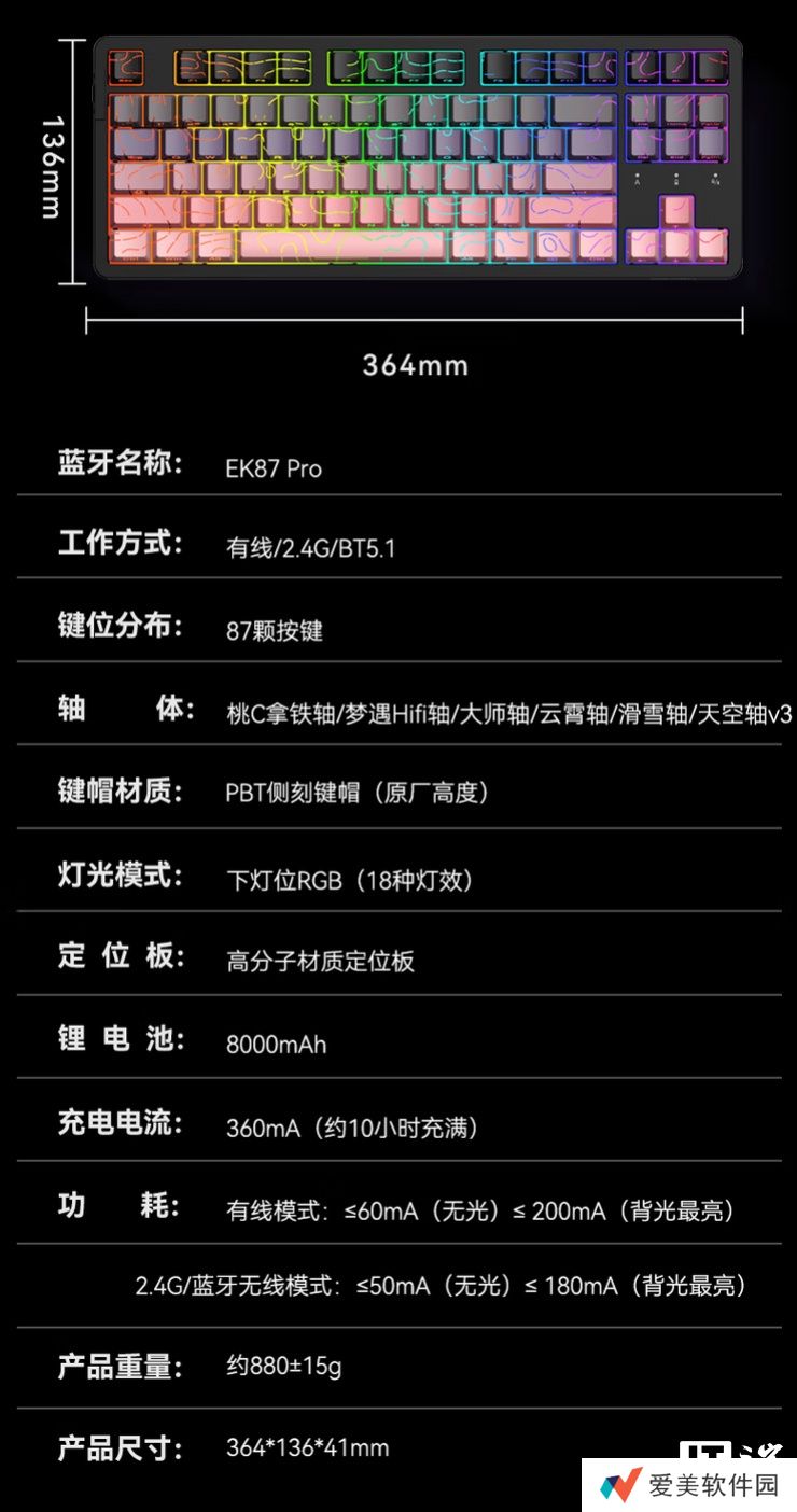 本站附达尔优 EK87Pro 键盘“黑莓粉渐变等高线”参数信息如下: