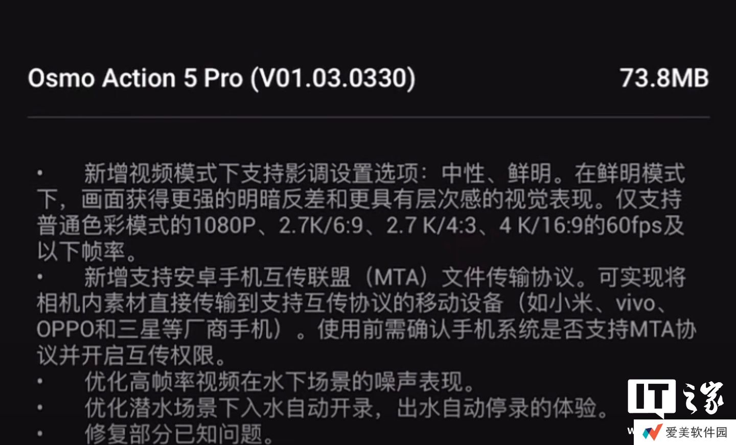 大疆现在为这款运动相机推送了最新的v01.03.0330 版本固件,宣布支持安卓手机互传联盟(MTA)文件传输协议,其他影像设备将陆续适配。