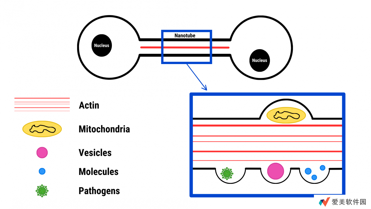 本站注:隧道纳米管是存在于细胞间的膜管样结构,可以在细胞间传输激素、酶、细胞器和囊泡等物质。但由于隧道纳米管结构易破坏、存在时间短以及形成后不稳定,观察其动态形成与功能存在一定难度。