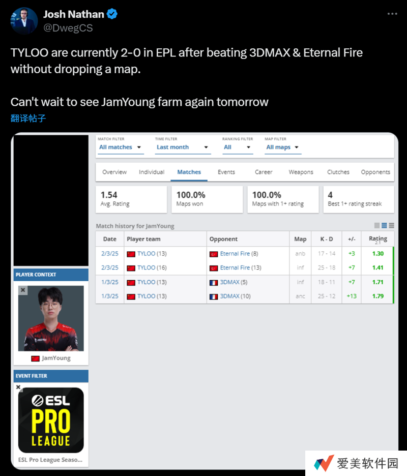 TYLOO在击败3DMAX和Eternal Fire后,目前在EPL(ESL Pro League)中以2-0的战绩领跑,并且一图未失。