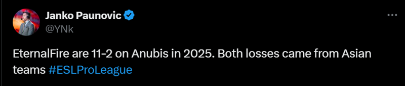EternalFire在2025年的阿努比斯地图上取得了11胜2负的战绩。这两场失利都来自亚洲战队。#ESLProLeague