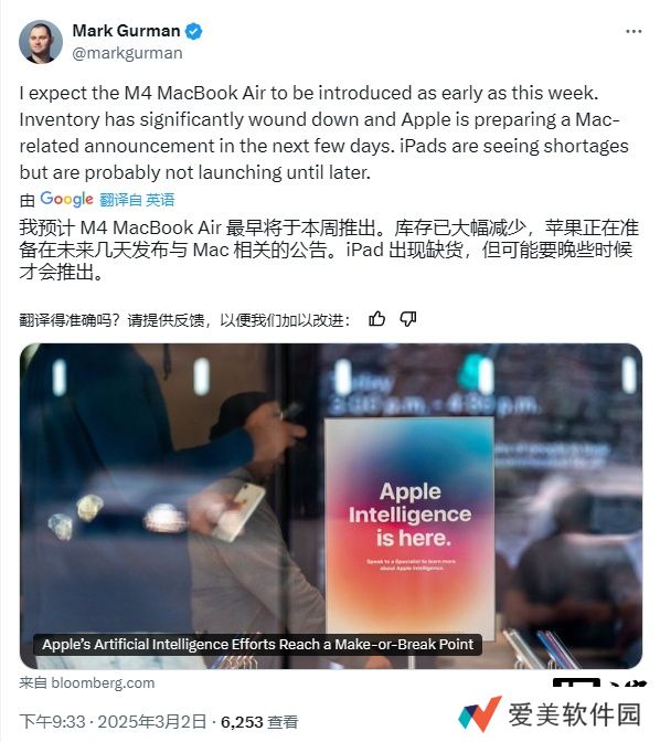 本站注意到,古尔曼今日在 X 平台发文称:“我预计 M4 芯片版 MacBook Air 最早将于本周发布。目前库存已大幅减少,苹果正在准备在未来几天内发布与 Mac 相关的产品公告。”